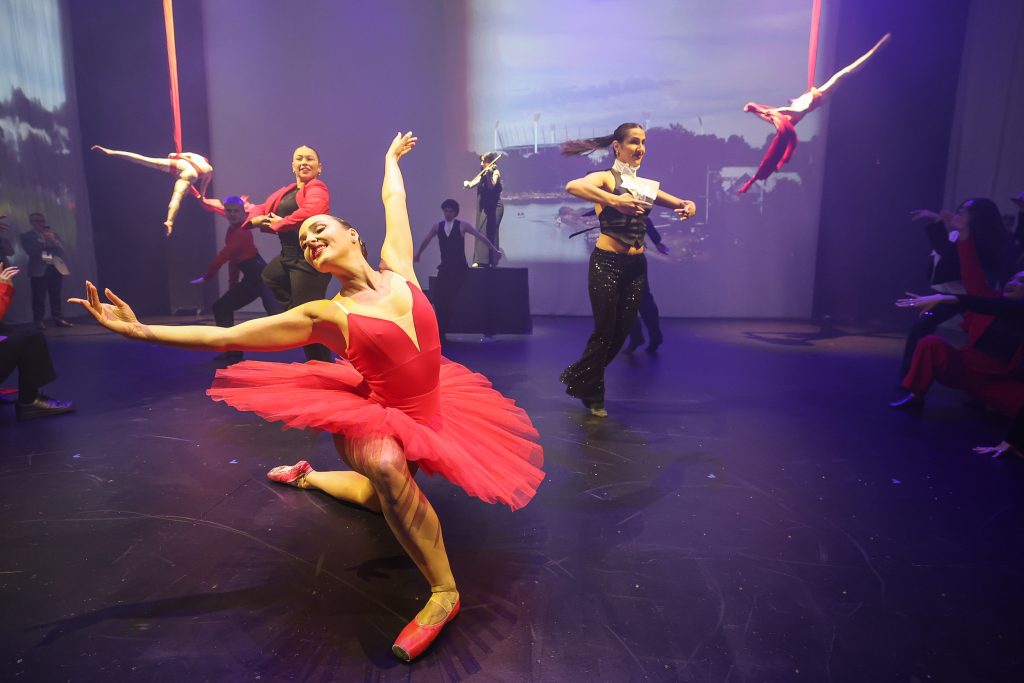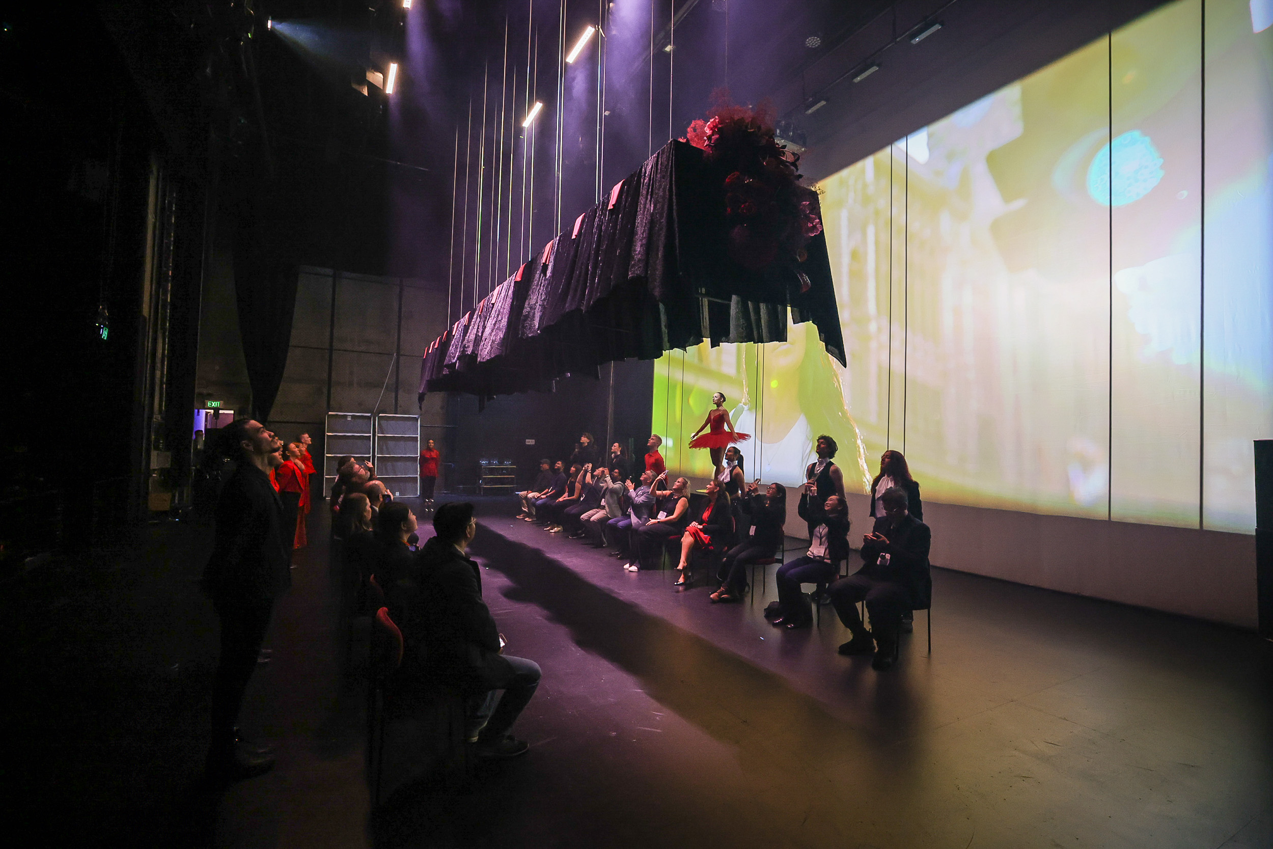 We headed into a what we thought was a room surrounded by drapes and were asked to stand along the sides by our chaperones, who broke into a beautiful dance in front of us. They were joined by aerial silk performers, as the music began and a video about Melbourne was projected onto the drapes.