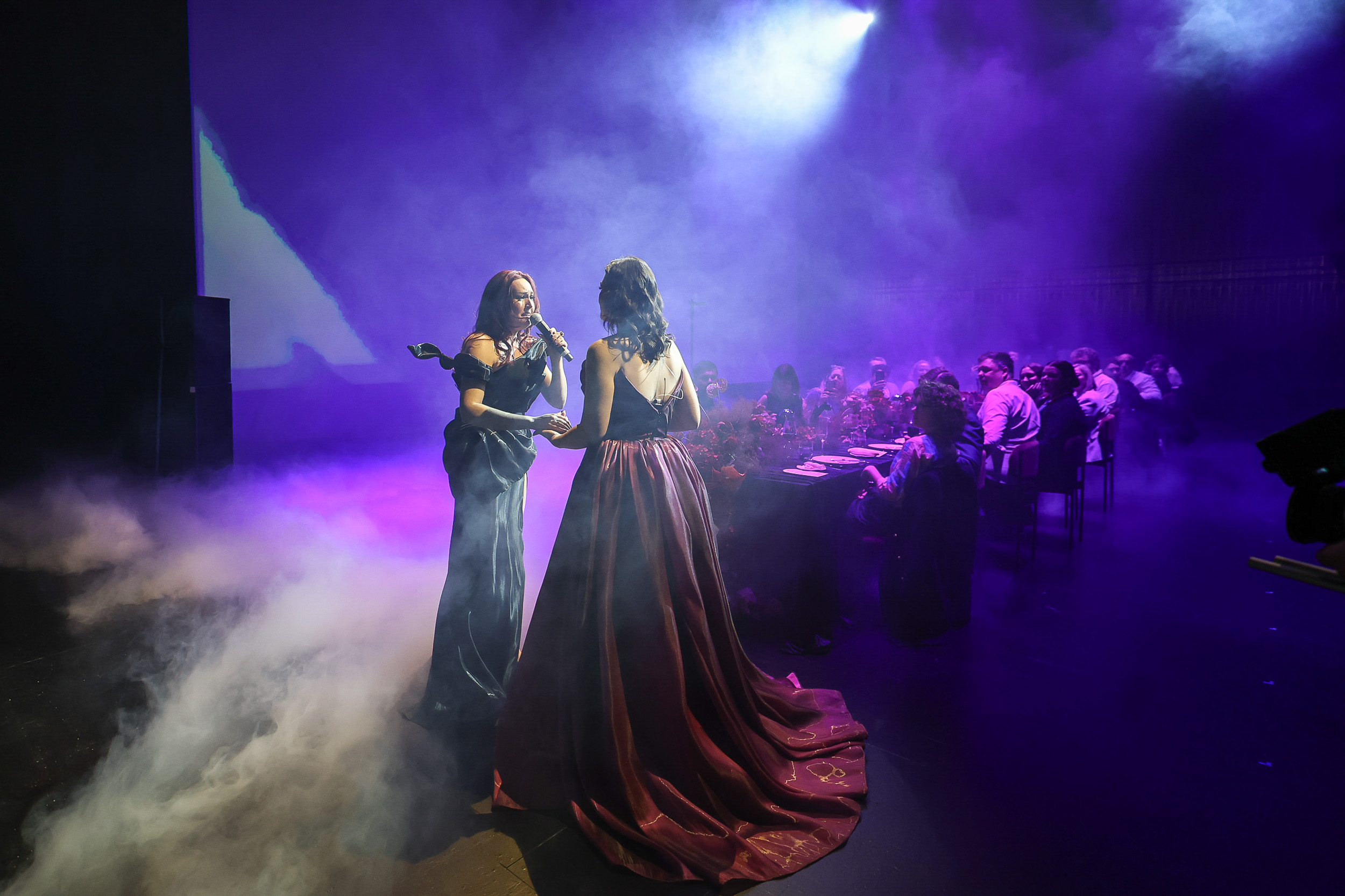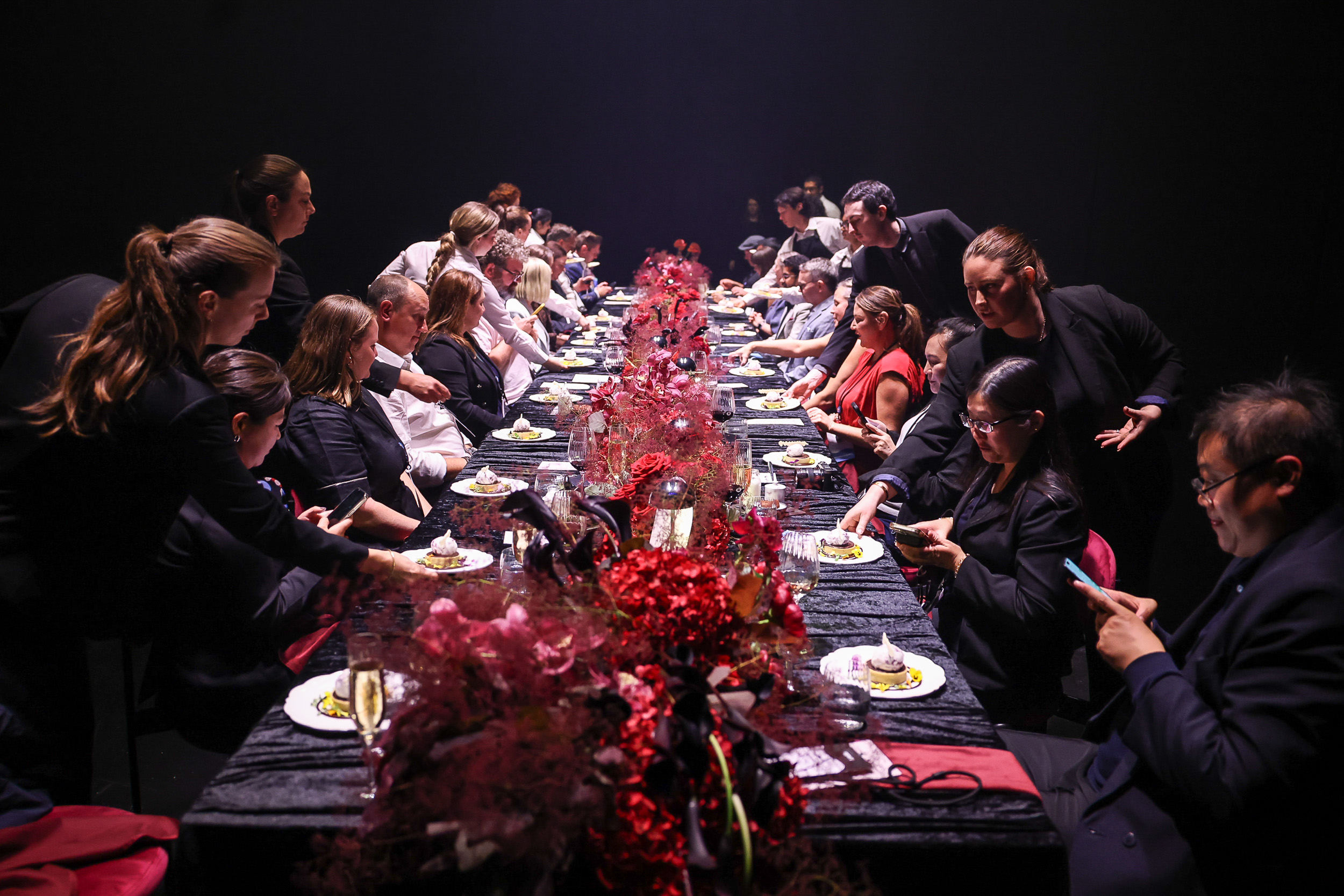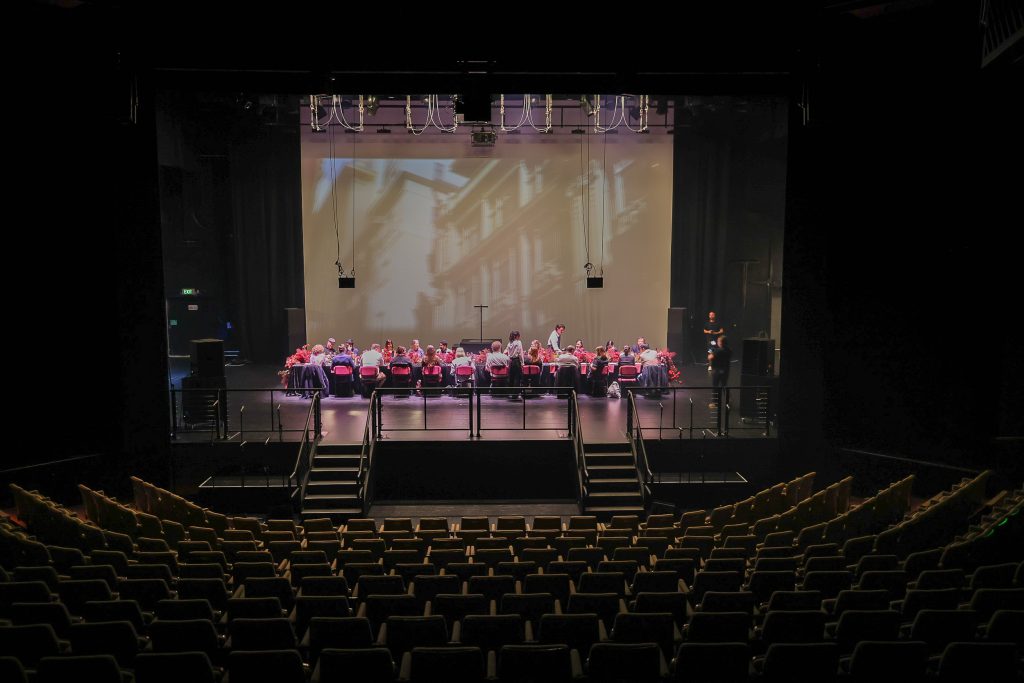 This all became clear as chairs appeared behind us, and the most stunning long table, set for lunch, was lowered from the ceiling above. As the drapes fell around us, we realised we were seated on the actual stage in the theatre – it was certainly a ‘wow’ moment.